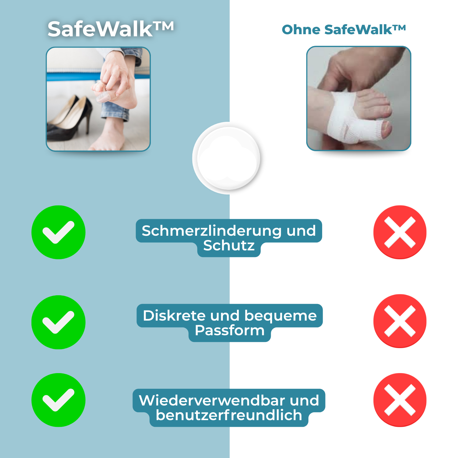 Har du ofta ont i tårna när du går eller sportar? Vårtor, friktion eller tryckpunkter gör varje rörelse till ett lidande? Med SafeWalk blir varje steg lätt och bekvämt igen. Idealisk vid blåsor, förhårdnader eller känsliga små tår.