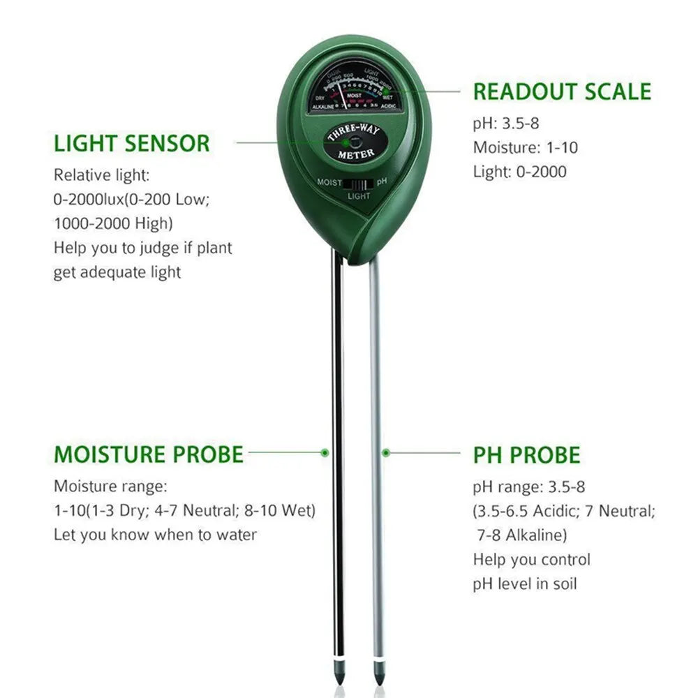 📌 3-i-1-funktion – Mäter exakt fuktighet, pH-värde (syra/bas-förhållande) och ljusförhållanden.