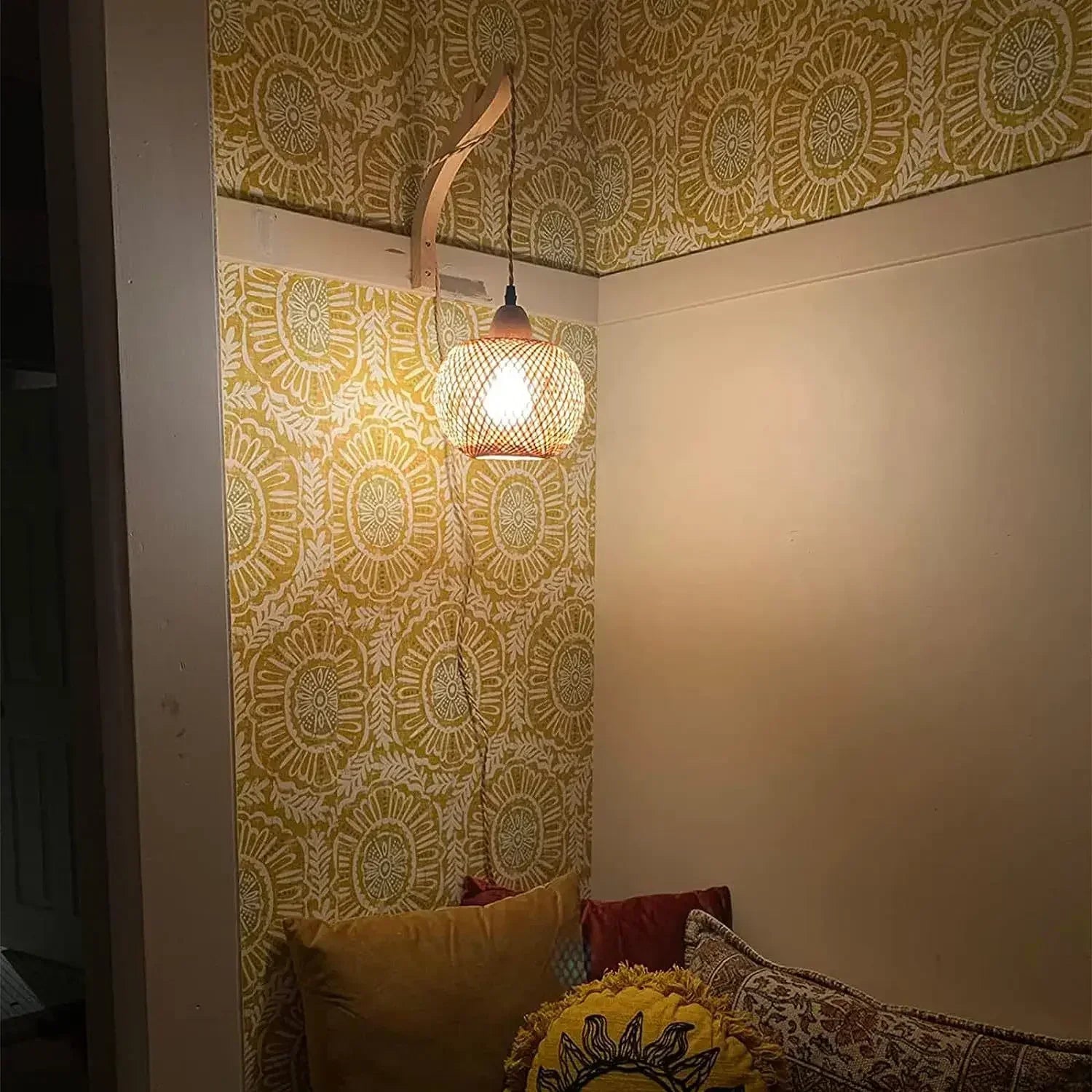 Denna charmiga vägglampa har en flätad bambuskupa som sprider ljuset vackert och skapar förtrollande skuggmönster. De naturliga texturerna ger varje rum en rustik och bohemisk känsla.