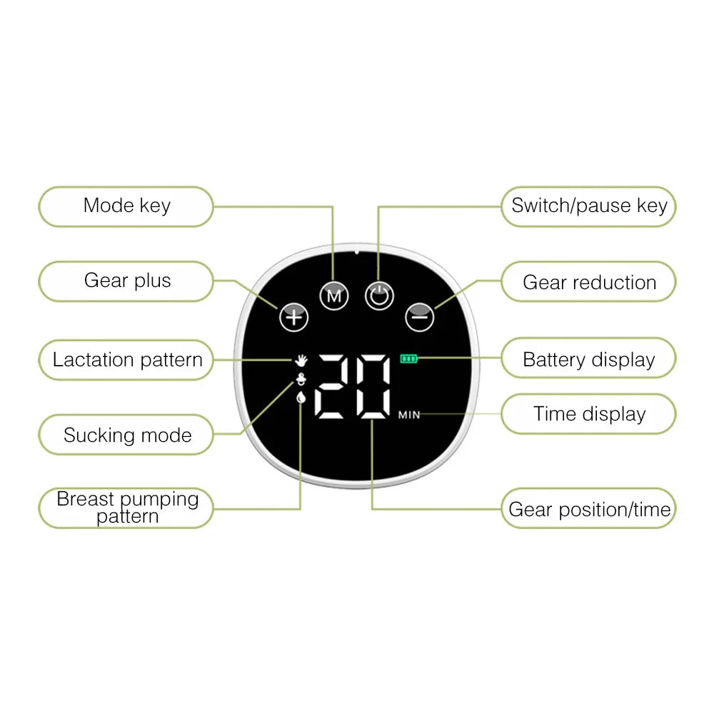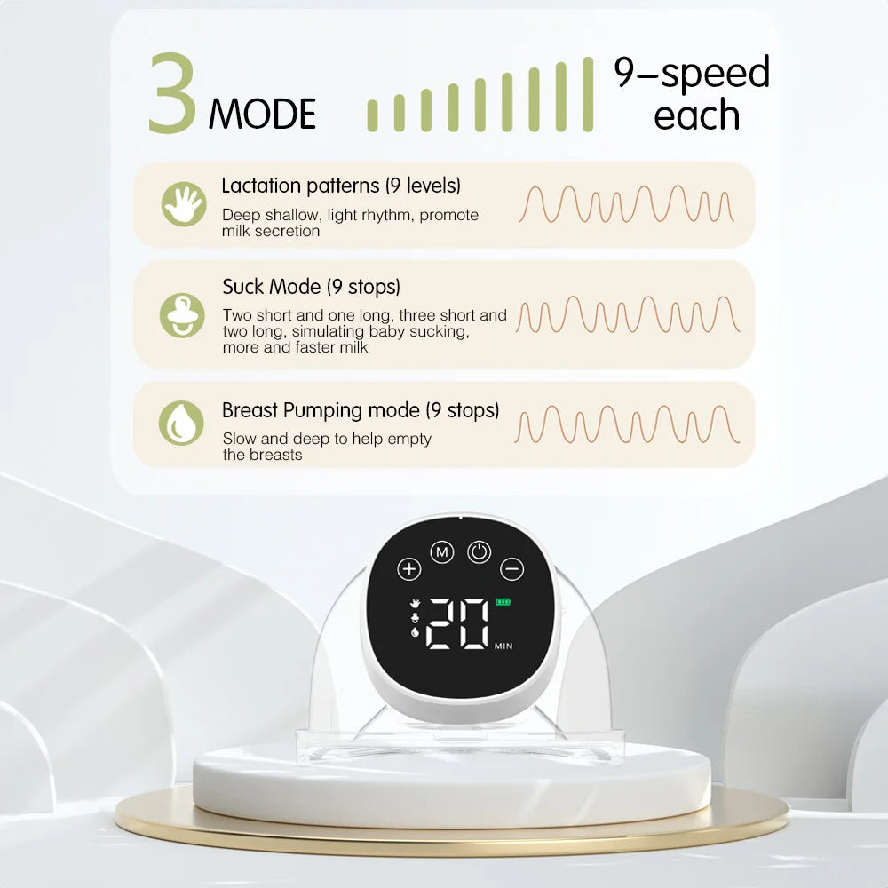 Anpassningsbara lägen: Anpassa din pumpupplevelse med tre valbara lägen – massage, uttryck och blandat läge – var och en erbjuder nio justerbara sugnivåer för optimal komfort och effektivitet.