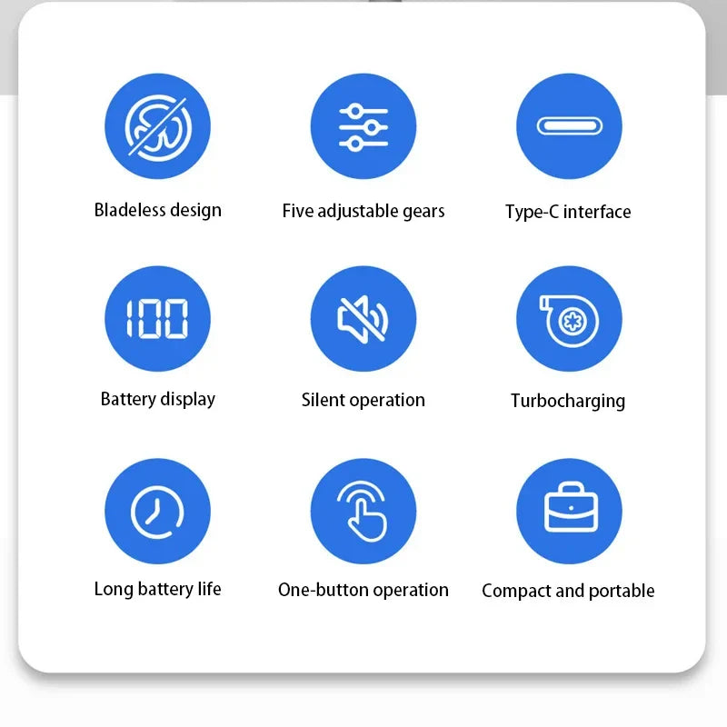 Maximal kraft i mini-format – Carvallo bladlös handfläkt erbjuder dig hög hastighet kylning med futuristisk design. Helt utan rotorblad, men med digital visning, 100 vindsteg och ett kraftfullt 3000mAh-batteri. Oavsett om du är på kontoret, reser eller på sommarlov – denna fläkt är din smarta friskepartner.