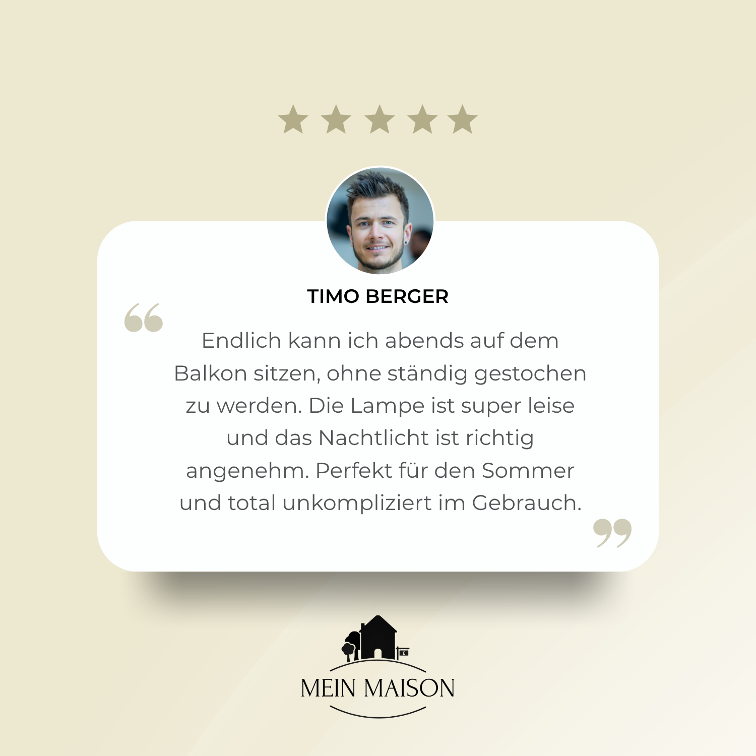 Njut av lugnet – helt utan myggstick – Carvallo mygglampan kombinerar modern design med pålitlig teknologi för insektbekämpning – helt ljudlös, giftfri och perfekt för familjer, barn och husdjur. Perfekt för sovrum, terrass eller campingplats.