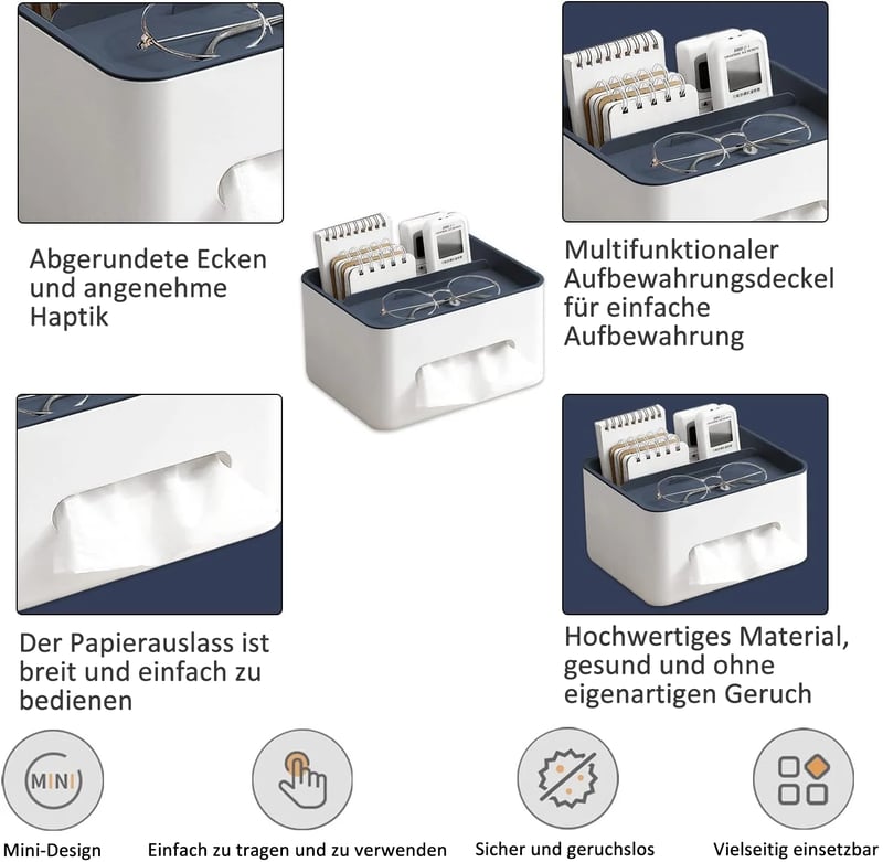 Ser ditt sängbord eller skrivbord ständigt rörigt ut? Med denna multifunktionella näsduksbox får du snabbt ordning – stiligt, stabilt och genomtänkt. Näsdukar, fjärrkontroller, smink eller pennor – allt har äntligen sin plats.
