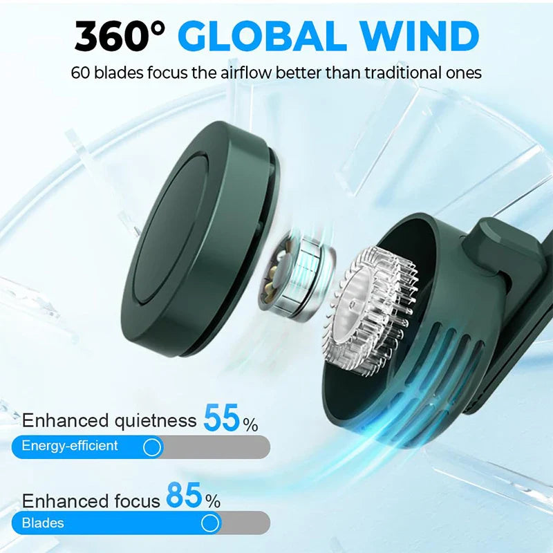 Carvallo Mini Fläkt | USB-Uppladdningsbar & Låg ljudnivå | Utan rotorblad | För att klämma fast på skjorta, bälte eller hals