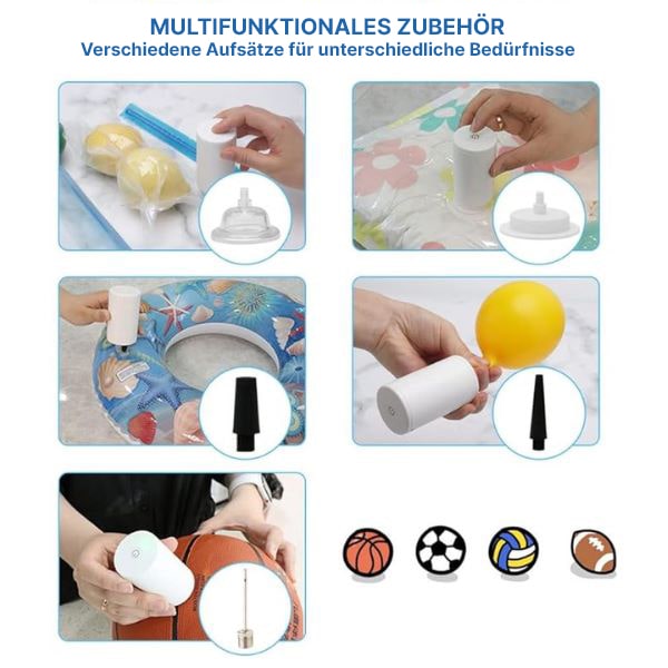Anslut enkelt det medföljande munstycket till ballonger, påsar eller sportbollar – idealiskt för att ha med sig!