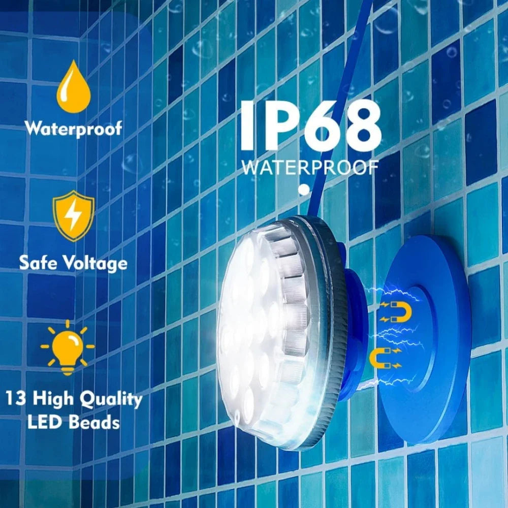 🎨 Dekorationstips: Placera flera AquaGlow Remote lampor i poolen eller brunnen för en imponerande ljusshow på natten.