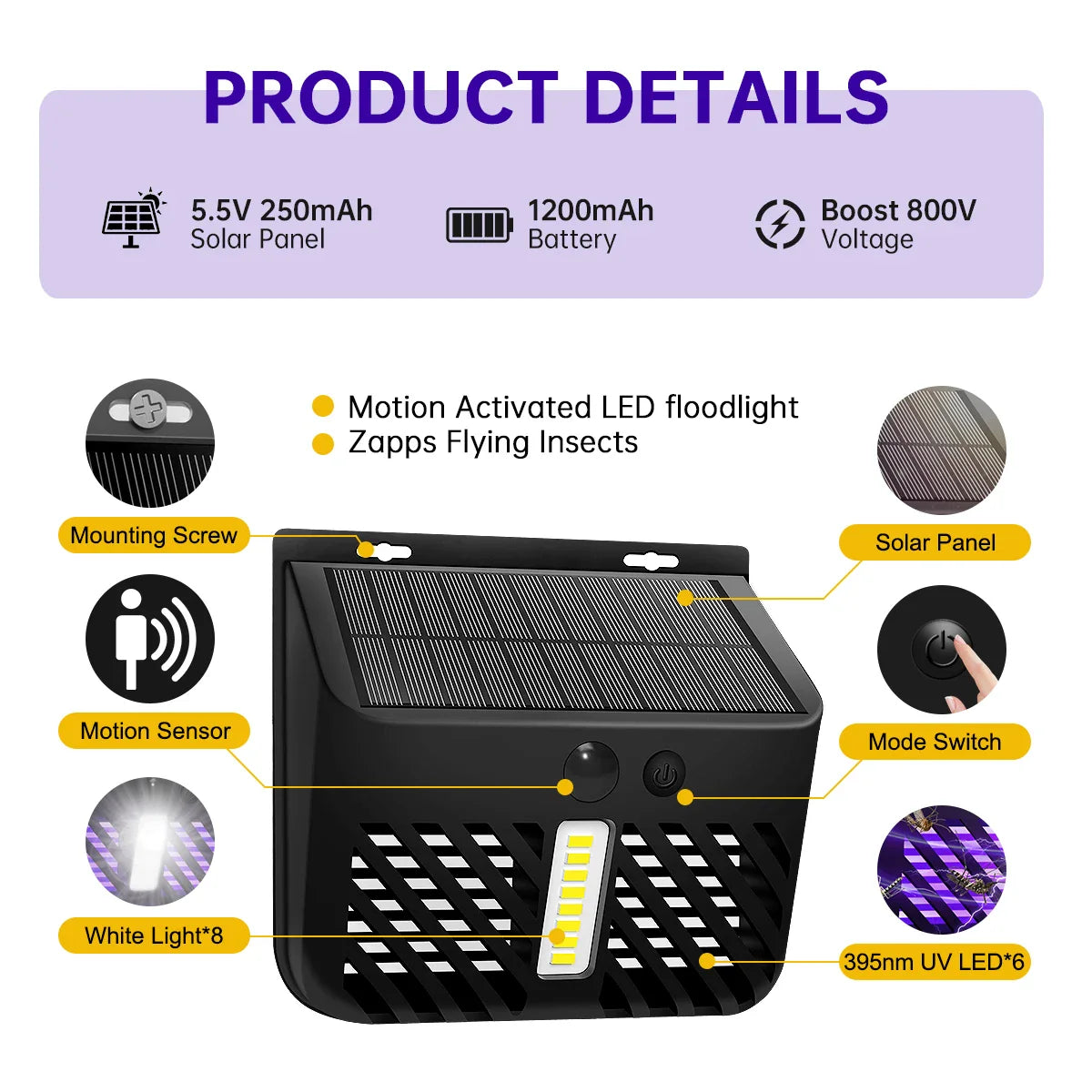Carvallo | Solar-Insektutrotare med LED-ljus | UV-myggholk för trädgård och terrass | 2 driftslägen | Vattentät