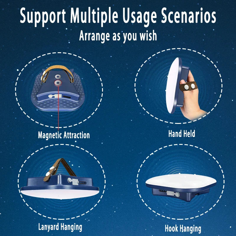 🧲 Magnetiskt & hängande: Två starka magneter för enkel fästning på metallytor + halkfritt hängare & bärrem – perfekt för tältstänger, motorhuvar eller arbetsbänkar.