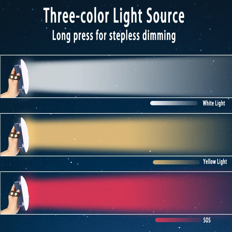 📌 4 ljusfärger & SOS-läge: Växla mellan 3300K (varmgul), 4500K (neutralvit), 7000K (kallvit) och röd SOS-blinkning – idealiskt för varje situation, från mysig tältbelysning till fara-varning.