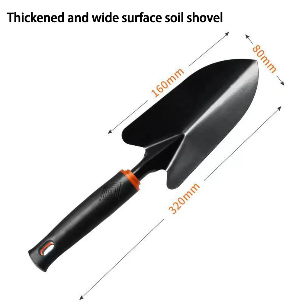 📌 Mångsidig användning – Innehåller fyra tillbehör: bred spade, smal spade, hacka och 5-tands räfsa – perfekt för plantering, lösning och jämning av jorden.