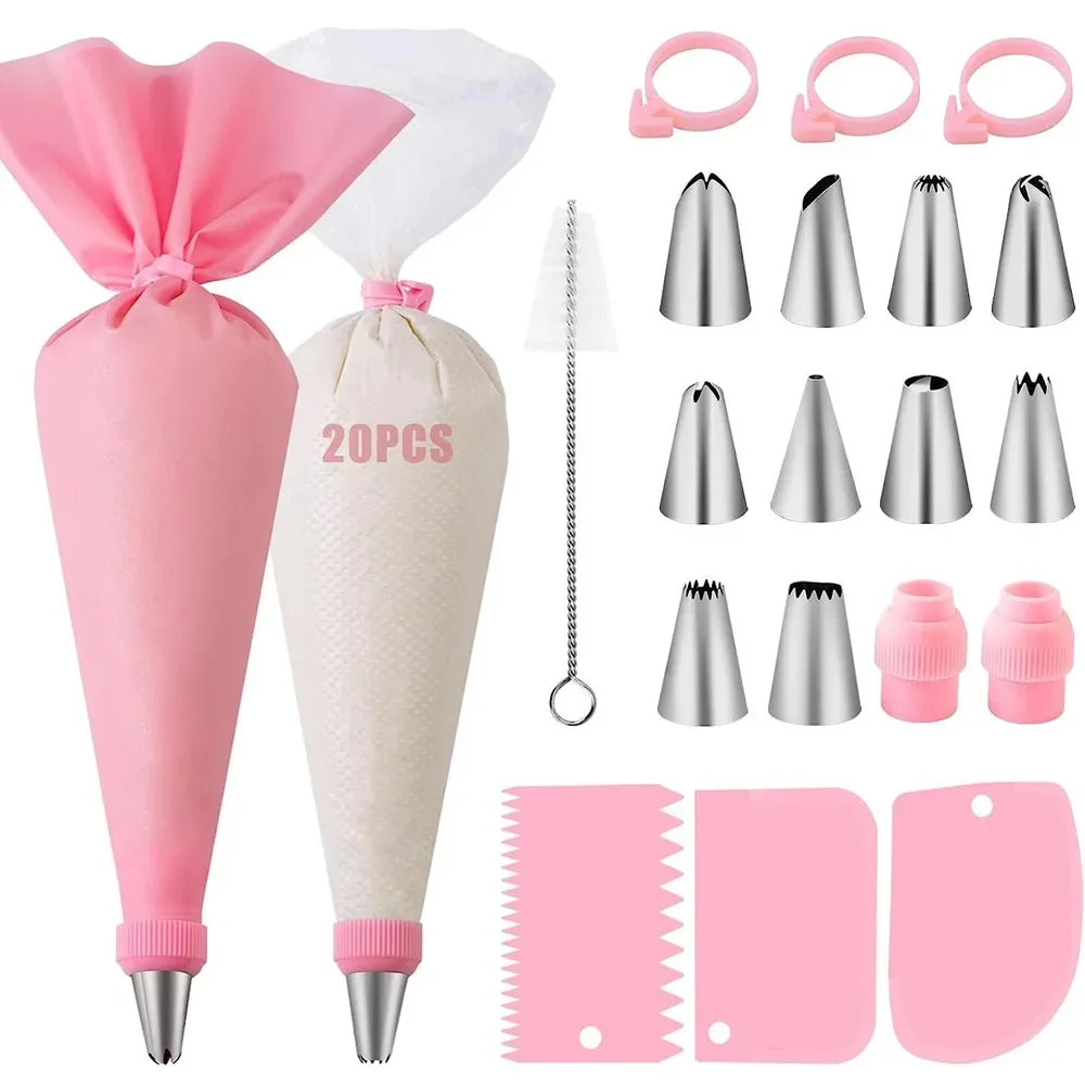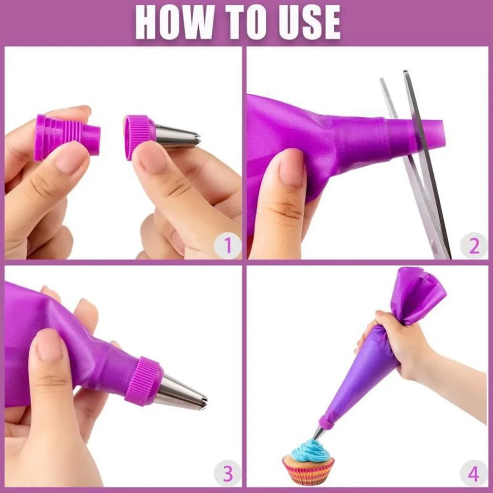 📌 Komplettset för tårtdecoration: Innehåller 10 spritsmunstycken i rostfritt stål, 1 återanvändbar silikon-spritsäck, 2 kopplingar, 3 degskrapor, 20 engångsspritsäckband, 1 rengöringsborste & 3 påseklipp – allt du behöver i ett set!