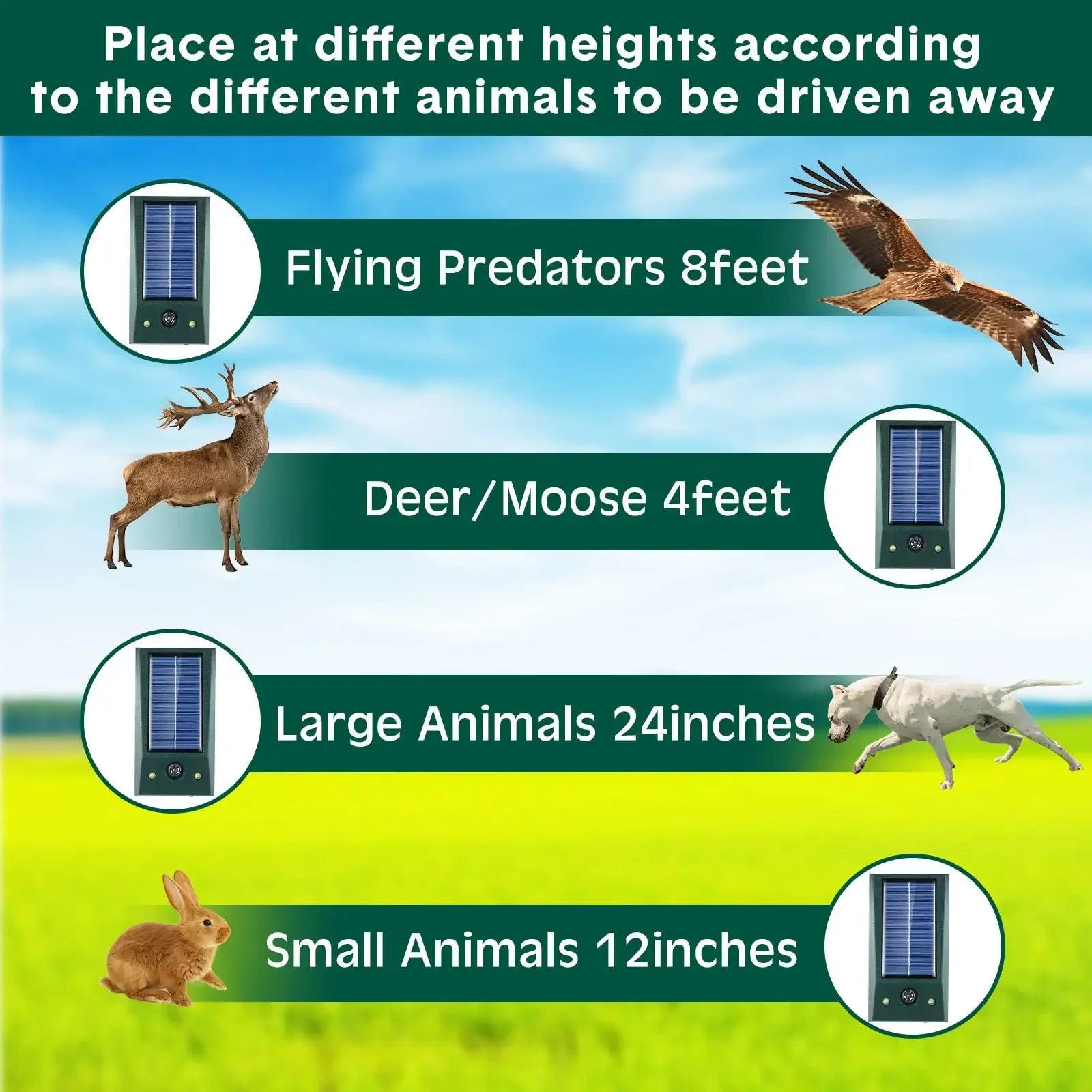 🎨 Multisensor teknologi: Kombinerar ultraljud, starka LED-bländande lampor och rörelsedetektering – för att permanent hålla djur borta utan att skada dem.