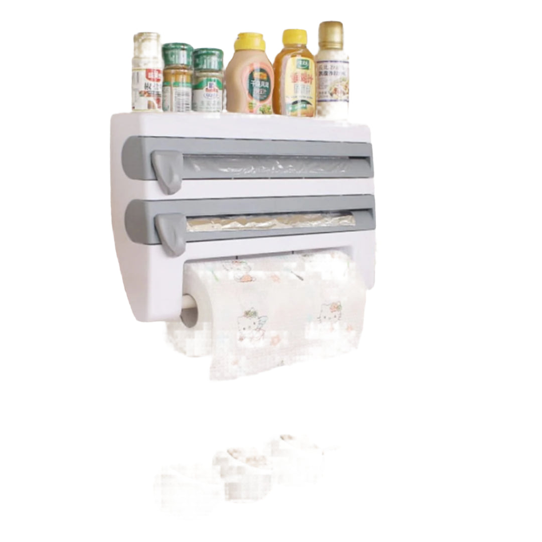 Strömlinjeforma din köksorganisation med Carvallo 4-i-1 väggmonterat köksförvaringsställ för hushållsfilm. Denna praktiska och eleganta organisatör är designad för att hålla dina viktiga köksartiklar som folie, hushållsfilm och kryddor snyggt organiserade och inom räckhåll, vilket sparar värdefull bänkyta.