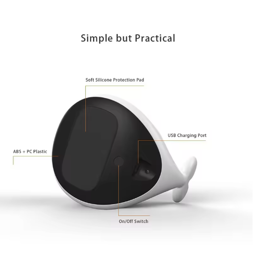 Den charmiga färgskiftande val-nattlampan är mer än bara en lampa – den är en trogen följeslagare för lugna nätter. Med sitt mjuka ljus och de skiftande färgerna skapar den en avslappnande atmosfär som hjälper till att avsluta dagen. Perfekt för barn som älskar nattljus eller som en dekorativ höjdpunkt i vilket rum som helst.