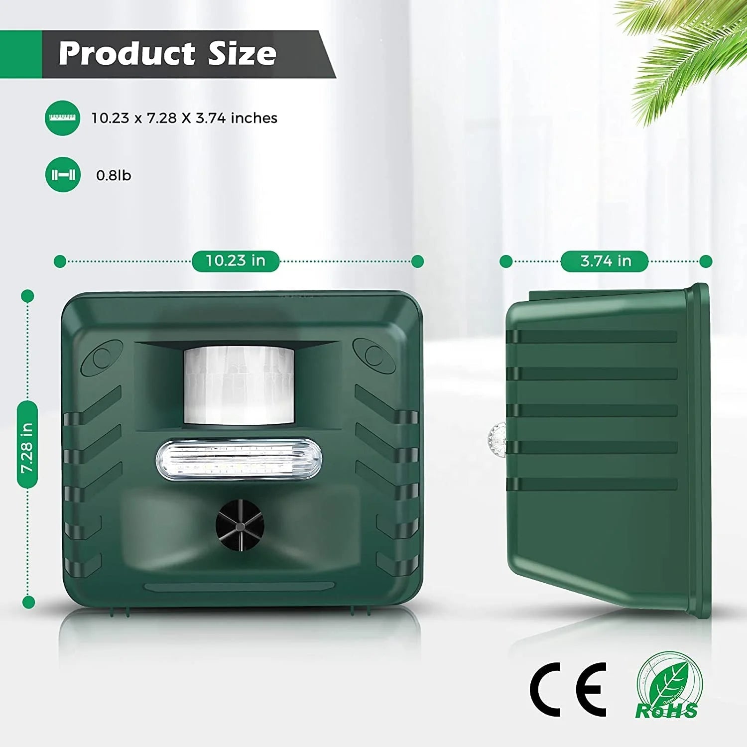Håll din egendom fågelfri med denna humana, kemikaliefri ultraljud fågelrepeller. Designad för att avskräcka hackspettar och andra besvärliga fåglar med en kombination av högfrekventa ljudvågor och blinkande LED-strobe-lampor, är det en smart, miljövänlig lösning för att skydda ditt hem, din trädgård och utomhusområden.