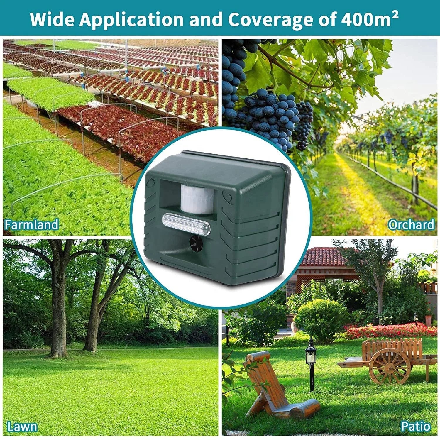 Täcker upp till en 170° horisontell av 60° vertikal fält, vilket ger omfattande täckning för altaner, sidoväggar, tak, fruktträdgårdar, trädgårdar och mer. Den justerbara fästen gör att du kan finjustera riktningen på avskräckaren för optimal effektivitet.