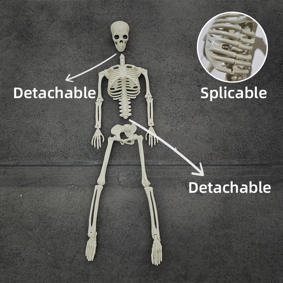Gör ett djärvt uttalande denna Halloween med en livslevande posable skelett som är både läskigt och roligt. Med en höjd på 90 cm och fullt rörliga leder kan denna beniga karaktär arrangeras i oändliga poser—perfekt för spöklika scener på din veranda, i trädgården eller som ett mittpunkt på din Halloween-fest. Lätt och enkel att hantera, det är ett måste för varje hemsökt hemma setup.