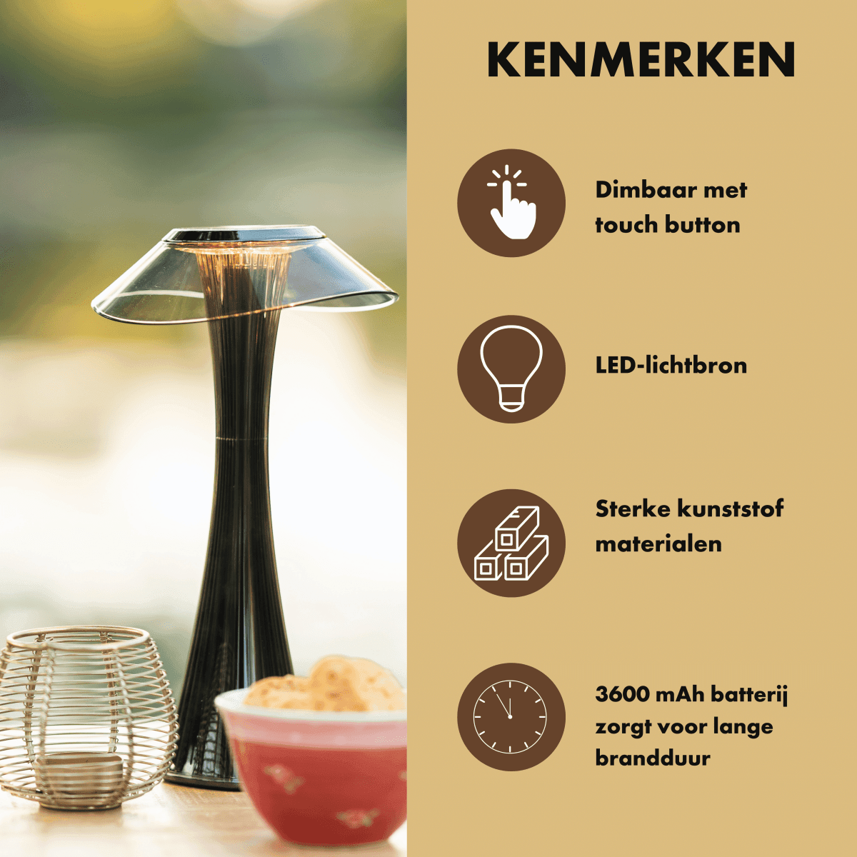 LoftLume Ambience Bordslampan är den perfekta kombinationen av design och funktionalitet. Denna trådlösa industriella lampa ger stämningsfull belysning och fungerar samtidigt som en dekorativ prydnad, både på och av. Tack vare det inbyggda uppladdningsbara batteriet kan du använda lampan överallt, utan att vara beroende av ett eluttag. Oavsett om du behöver stämningsbelysning, en nattlampa eller en praktisk skrivbordslampa, anpassar sig LoftLume sömlöst efter dina behov.
