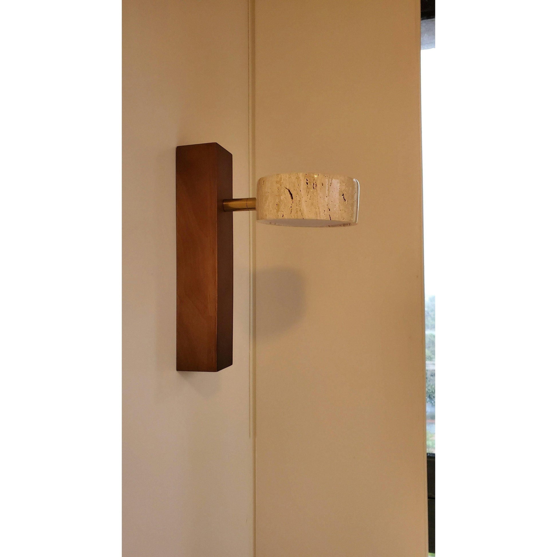 Tillverkad av äkta travertin och massivt trä, vilket ger varje lampa en unik struktur. -