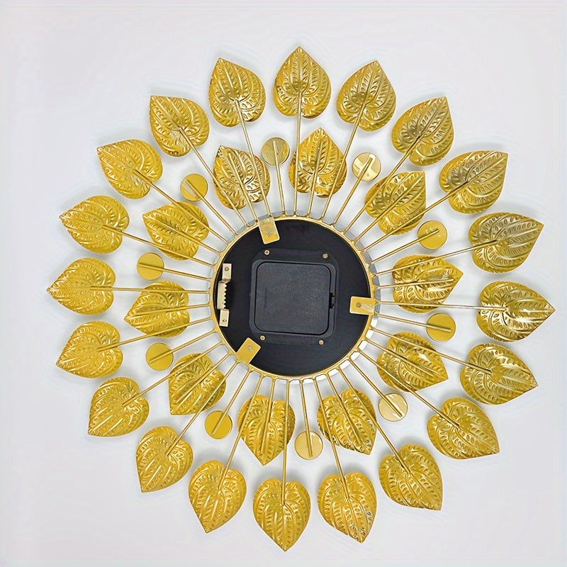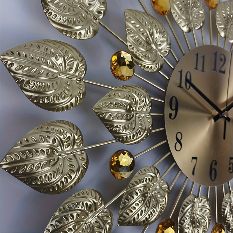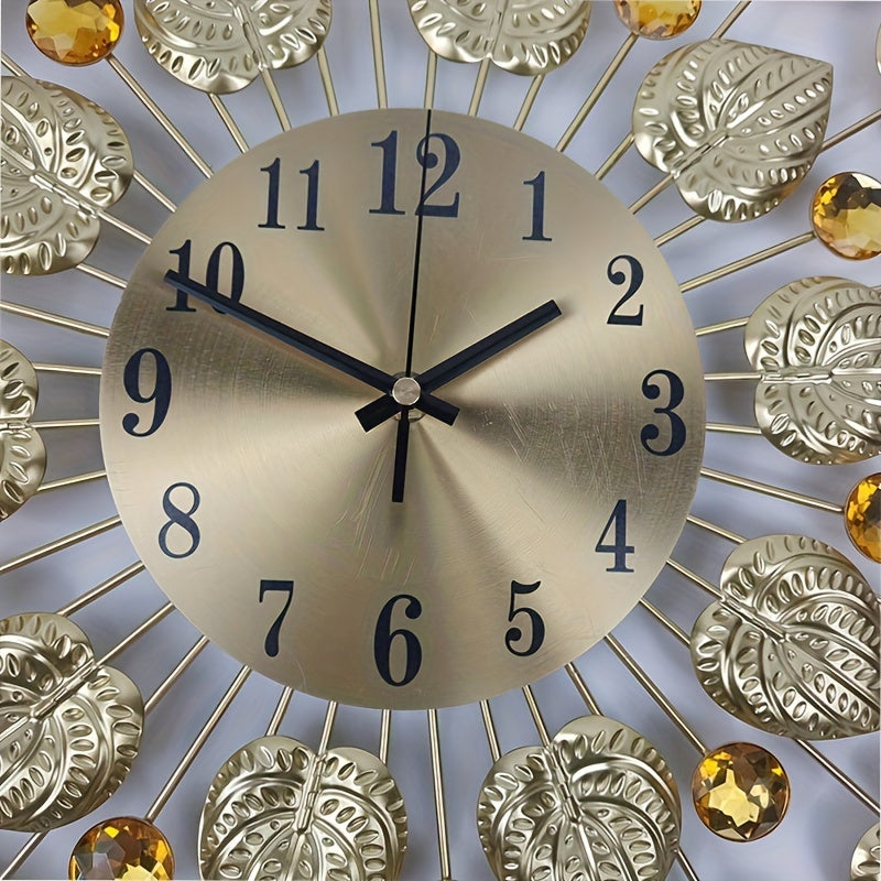 Modern Tyst Väggklocka med Guldbladdesign – Metall, Rund Klocka, AA Batteri, Tyst för Vardagsrum och Matrum