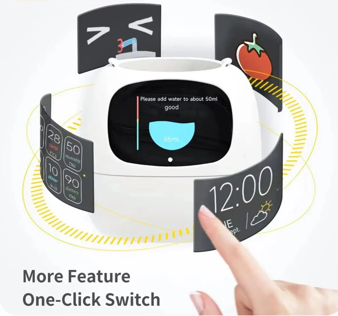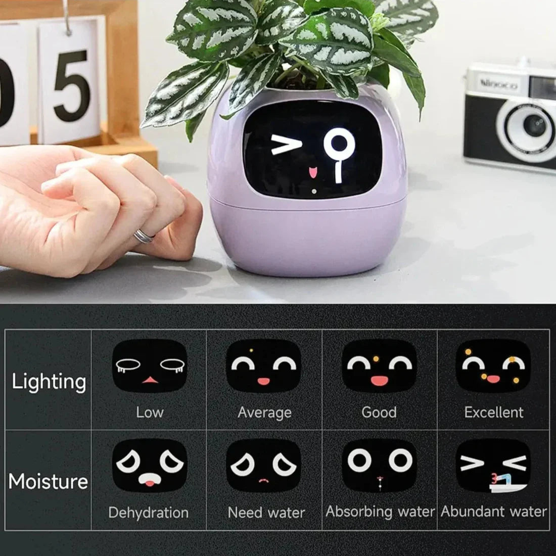 - Interaktiv display: Krukan har ett sött ansikte med över 49 rika uttryck, vilket lägger till en rolig och engagerande touch till växtskötseln.