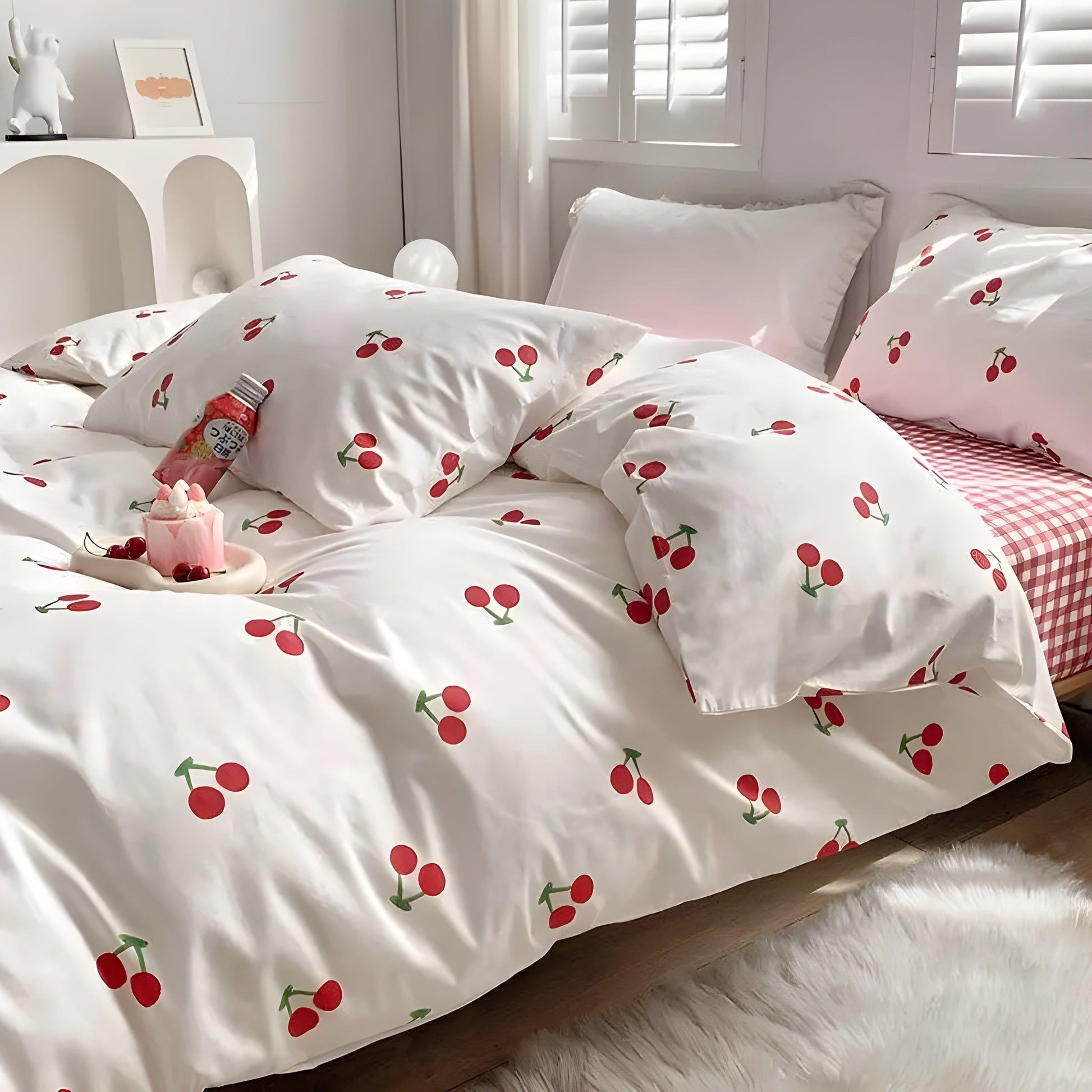 Det lekfulla körsbärsmönstret ger ditt sovrum en fräsch och modern känsla. -
