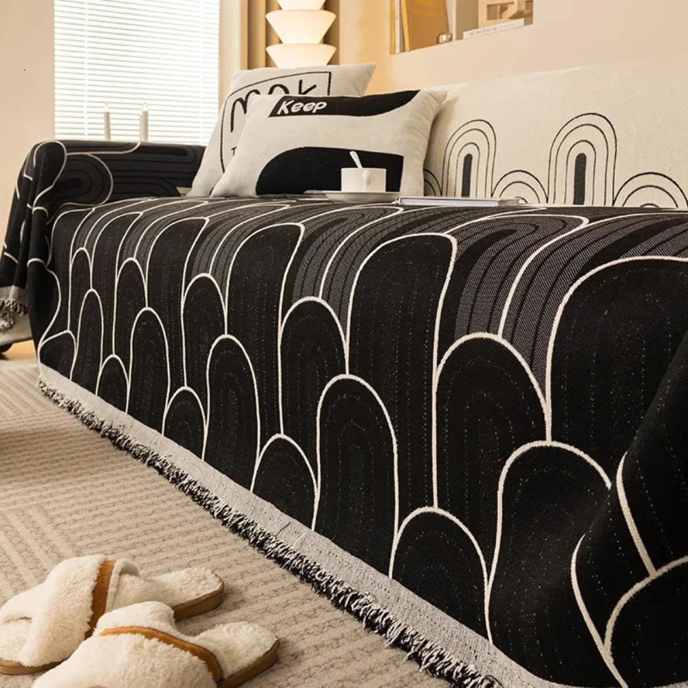 Höj din inredning med detta mysiga chenille-sofföverdrag. Dess mönster med regnbågsbågar ger en färgklick till vilket rum som helst, medan det mjuka tyget och fransdetaljerna gör det både stiligt och funktionellt för året runt användning.
