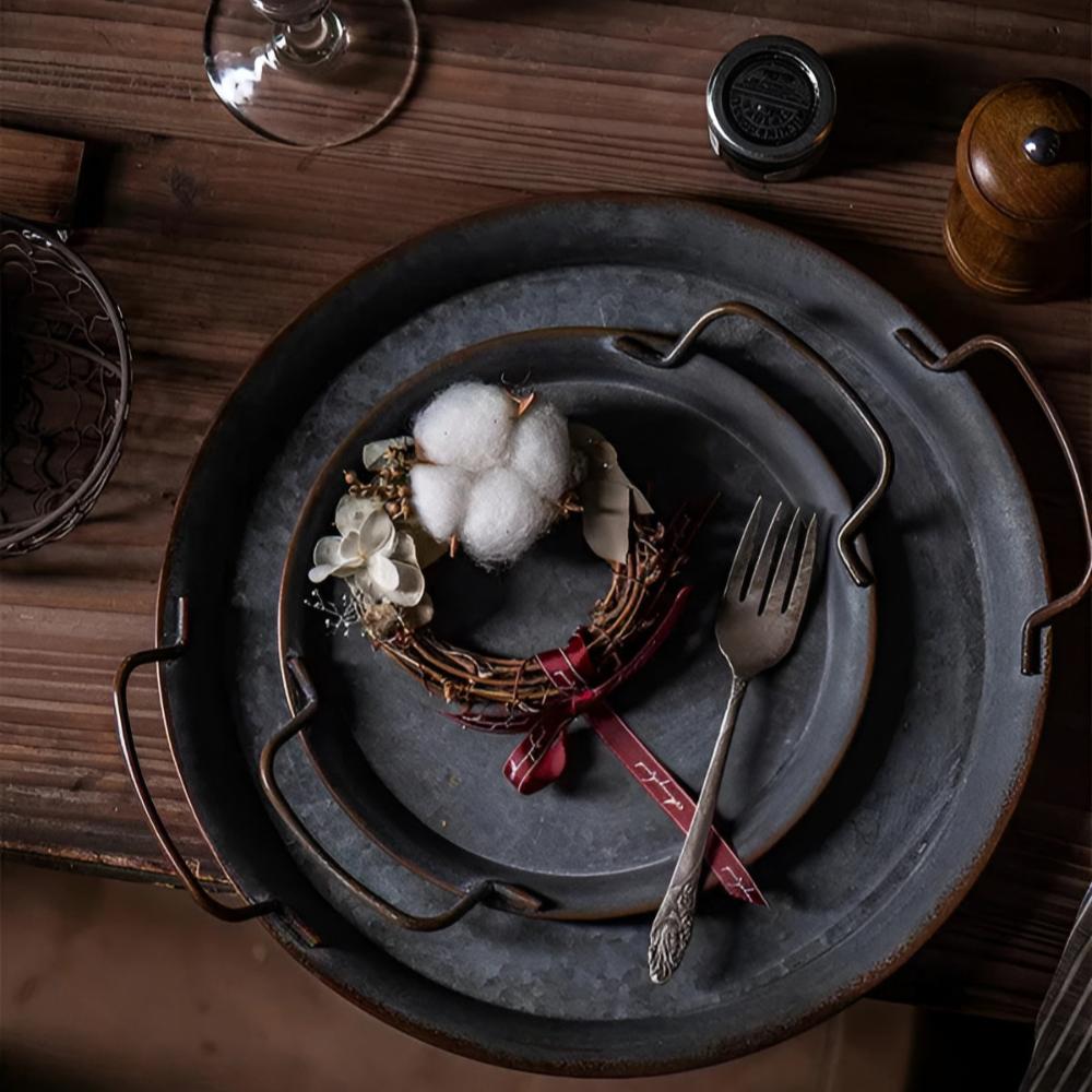 Höj varje måltid med den tidlösa charmen av Retro Rund Metall Middagsserveringsbrickor. Designade med intrikata mönster och rustika detaljer, dessa brickor kombinerar praktikalitet med klassisk elegans. Tillverkade av solid, sliten järn, är de idealiska för servering, styling eller för att lägga till en touch av vintage sofistikering till varje tillfälle eller utrymme.
