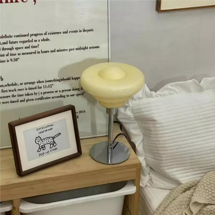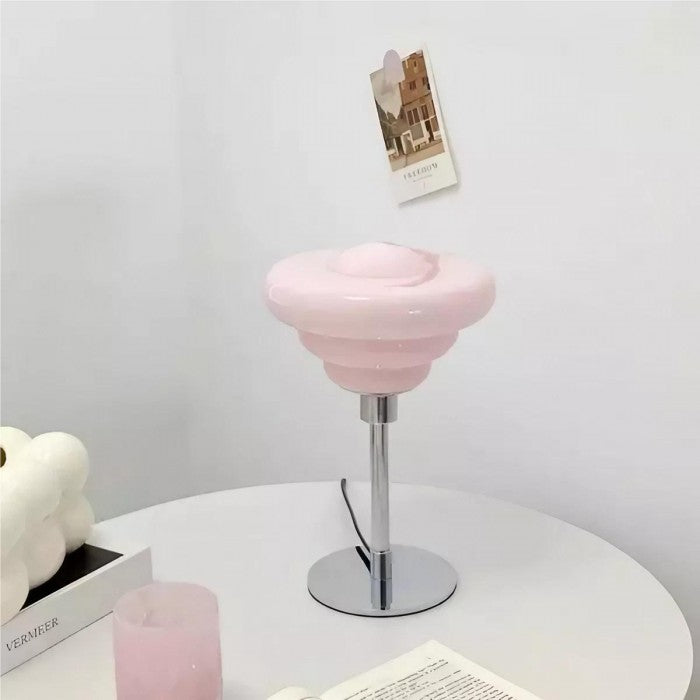 Denna Egg Tart Ripple Glass Bordslampa för med sig avantgardedesign till ditt rum. Den unika flerlagsglasstrukturen skapar en fängslande ljus- och skuggeffekt. Med en blomknopp-inspirerad form lägger den till ett inslag av elegans och modernitet i varje miljö.