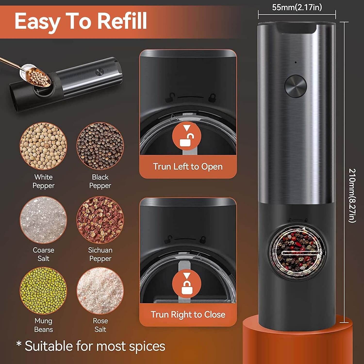 Höj dina kulinariska färdigheter med Royallure uppladdningsbara elektriska salt- och pepparkvarnen set. Tillverkad av premium rostfritt stål, erbjuder detta moderna köksverktyg stil, precision och bekvämlighet. Utformad för enkel hantering med en hand, gör den att du kan krydda dina rätter utan ansträngning—perfekt för att multitaska medan du lagar mat eller underhåller.