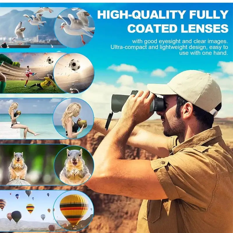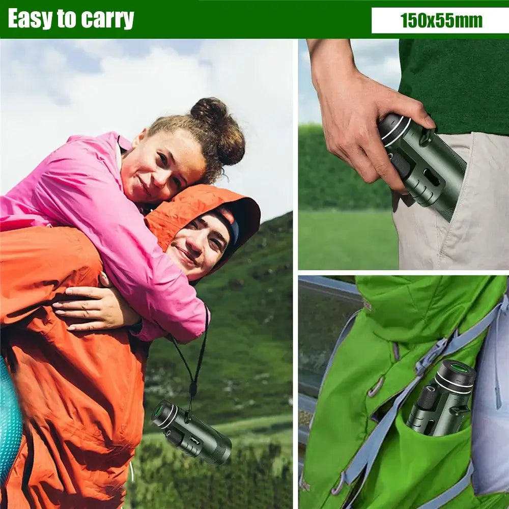 Upplev världen som aldrig förr med Royallure Portable HD Monocular Telescope, som har en imponerande 80X förstoring som får varje detalj att framträda i skarpt fokus. Med avancerad BAK-4 prisma-teknologi och ett helt flerbelagt linsystem, förbättrar denna monokulär ljusöverföring och ljusstyrka, vilket säkerställer att du njuter av klara, levande bilder även på avstånd. Oavsett om du vandrar, fågelskådar eller deltar i utomhusevenemang, är detta mångsidiga teleskop designat för friluftsentusiaster som kräver kvalitet och prestanda. Designad för bekvämlighet och hållbarhet, är vår monokulär utrustad med en 50mm objektivlins och en 20mm okular, vilket ger en vidvinkel som fångar fantastiska scener och vilda djur. Med en anmärkningsvärd överföringshastighet på 99,5% presterar den utmärkt under svag belysning, vilket gör den idealisk för nattsyn. Den ergonomiska, vattentåliga designen säkerställer skydd mot fukt och damm, så att du kan fokusera på ditt äventyr utan oro.
