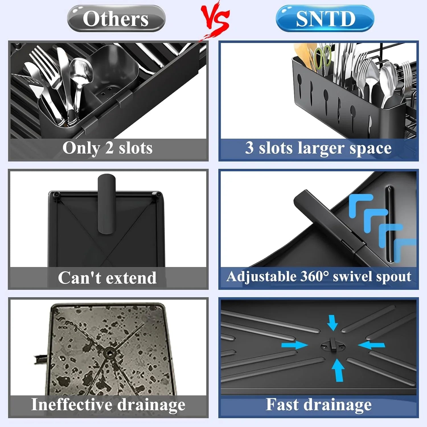 Transformera din köksupplevelse med Royallure Large Dish Drying Rack, utformat för att förbättra effektivitet och organisering. Denna robusta diskställ har en oberoende, större bestickhållare som överträffar standardmodeller, med tre dedikerade platser för skedar, gafflar och knivar. Säg adjö till röran och hej till en mer bekväm arbetsyta i köket. Den innovativa designen säkerställer att dina redskap är lättillgängliga, vilket gör matlagning och städning till en enkel uppgift. Diskställningen är utrustad med ett uppgraderat dräneringssystem som inkluderar en justerbar svängbar avlopp och en lutande dräneringsbräda. Denna genomtänkta design förhindrar effektivt vattenläckage och säkerställer att dina bänkskivor förblir torra och prydliga. För optimal prestanda, se till att din kökskran är i linje med bänkskivan för bästa dräneringsupplevelse. Höj din köksorganisation med detta oumbärliga verktyg som kombinerar funktionalitet och stil.