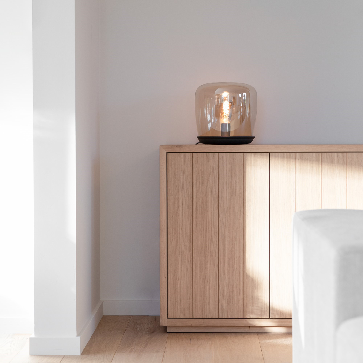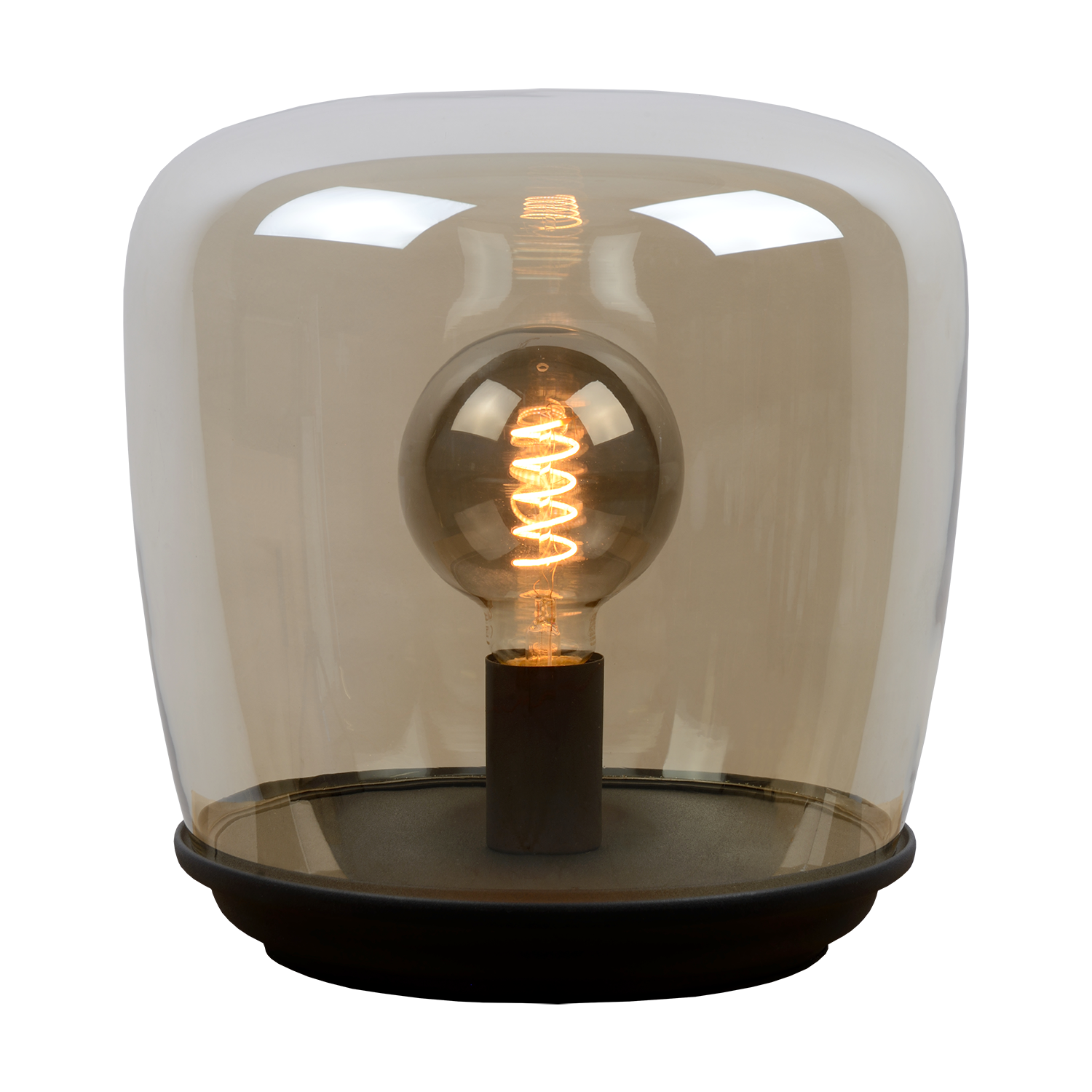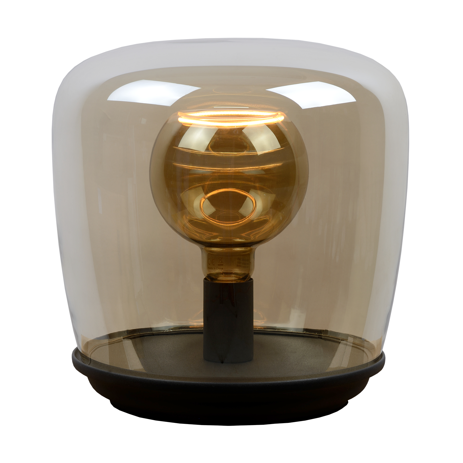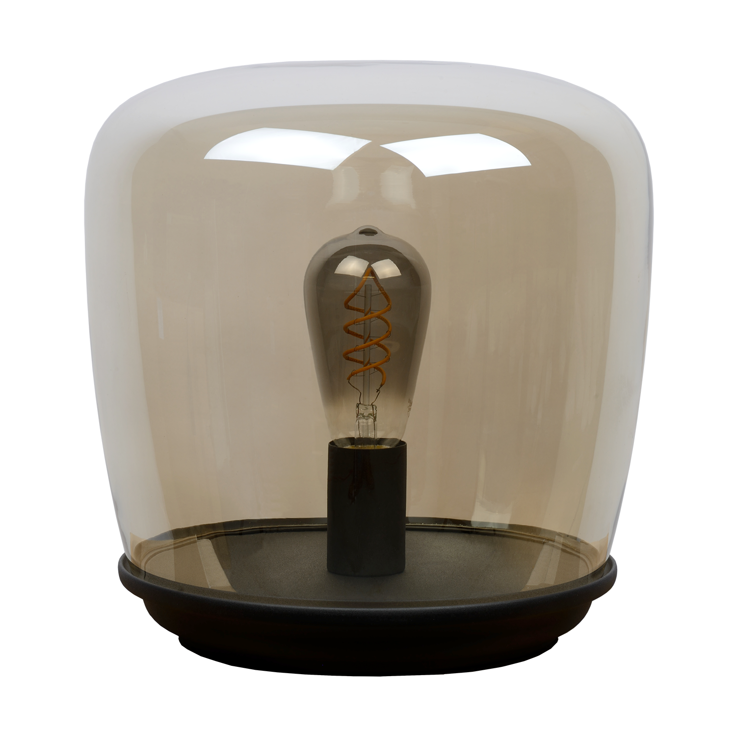Ta dig tid att betrakta bordlampan Unama från varje vinkel och upptäck de många fördelarna. Först och främst fångar den den vackra ballonformade lampkupolen, följt av det varma ljuset som sprider sig genom rummet via den synliga ljuskällan (ingår ej) genom det amberfärgade glaset. Glaskupan vilar på en svart metallskål. Men det bästa kommer ännu: sätt på ljuset och njut av de strålande reflektionerna i bollen. Oavsett om den står i ett stilla hörn eller på en framträdande plats i rummet: denna bordslampa tillför just den där lilla extra touch till varje rum.