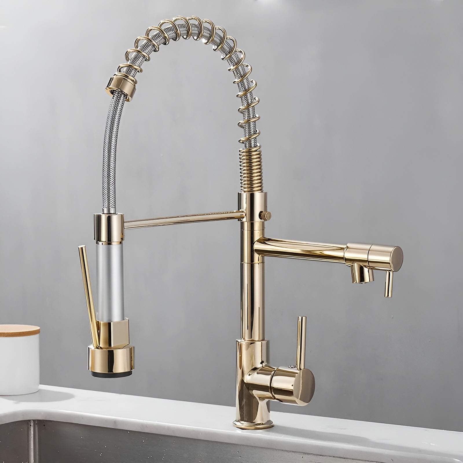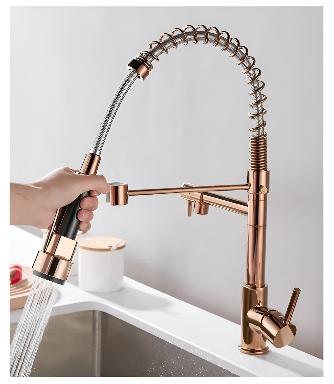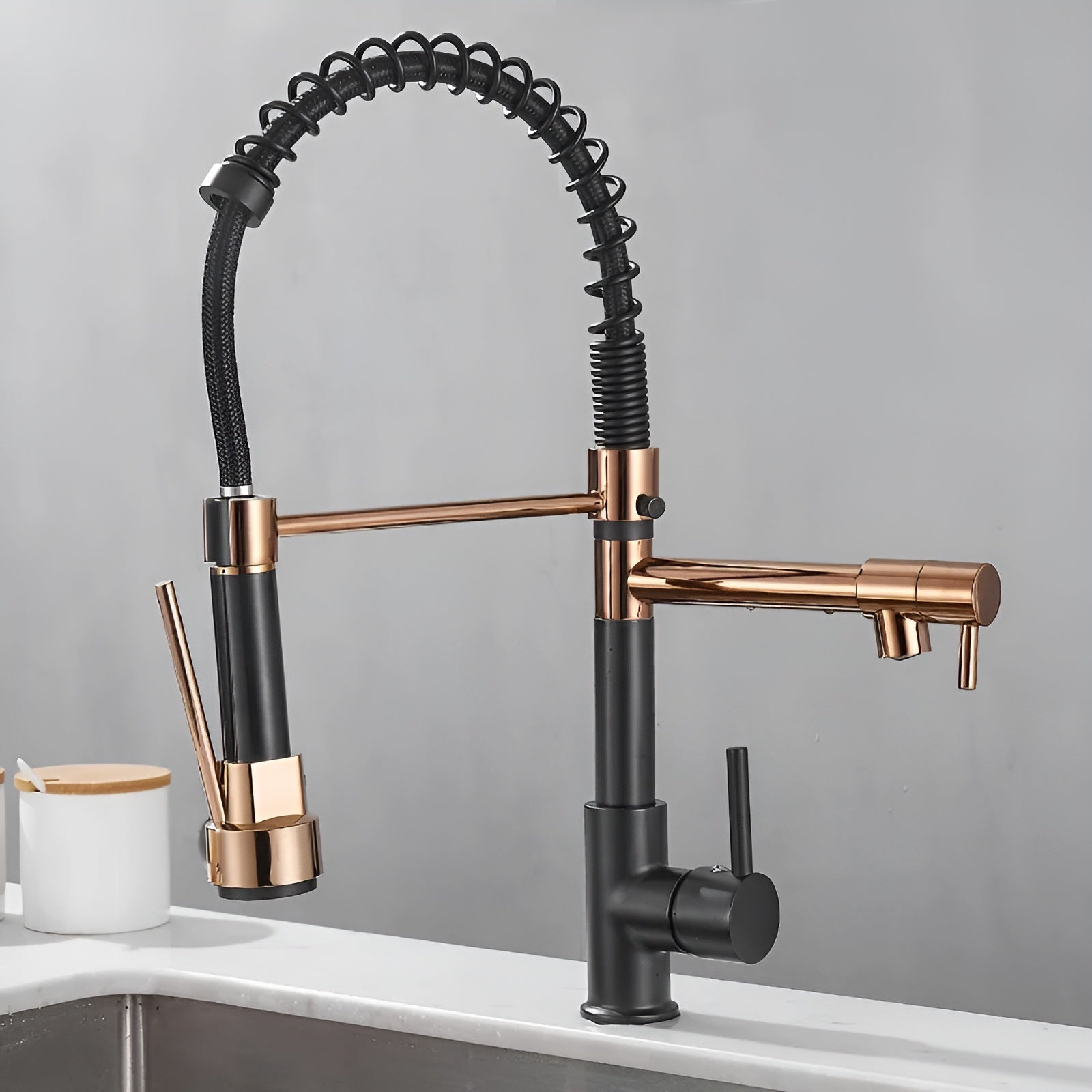 Letar du efter ett sätt att kombinera stil och effektivitet i ditt kök? TwinStream kökskran erbjuder båda! Denna dubbla ström köksblandare är tillverkad av högkvalitativ brons och imponerar med sin svarta och guld finish. Den flexibla fjädradesignen gör det enkelt att justera vattenflödet, perfekt för vardagliga sysslor som diska och matberedning.