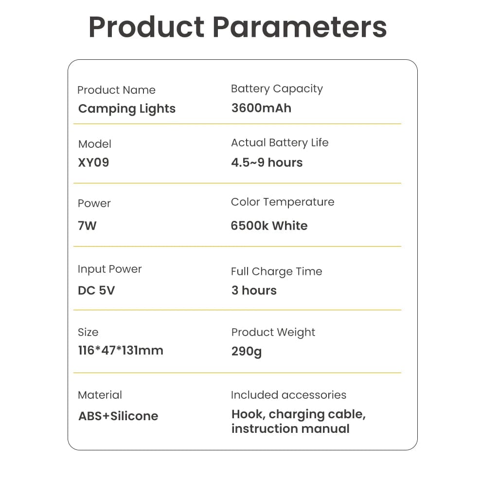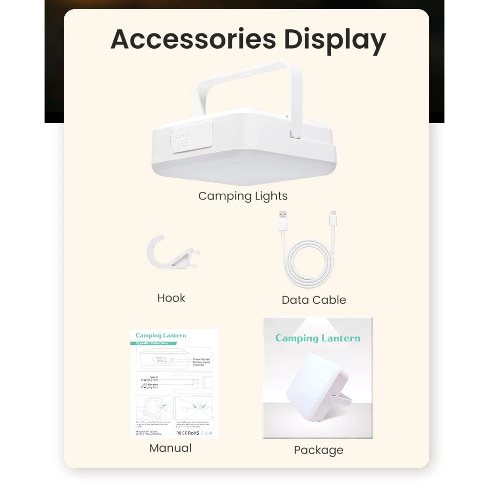 Denna mångsidiga LED campinglampa är utformad för utomhusentusiaster och erbjuder en pålitlig ljuskälla för camping, vandring och nödsituationer. Med en inbyggd 3600mAh power bank säkerställer den att du förblir uppkopplad medan du njuter av naturen.