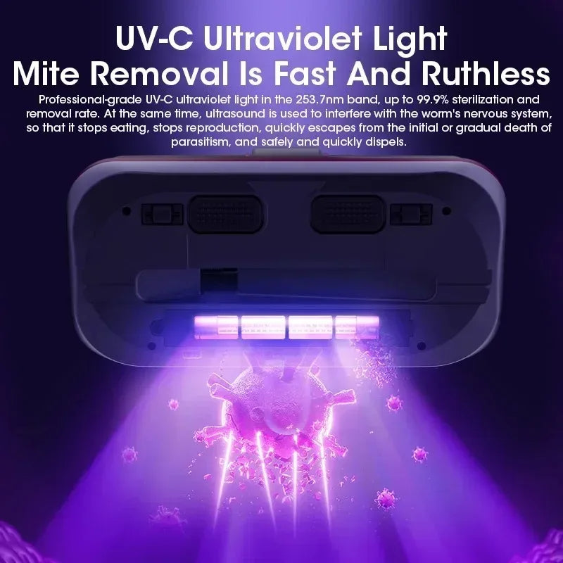 Genom att använda 253,7 nm UV-C ljusdödar denna enhet 99,99% av dammkvalster, bakterier och allergener vid kontakt. Tillsammans med ultraljudsteknik som stör kvalsters nervsystem, stoppar det reproduktionen vid källan – vilket håller din säng fräschare längre.