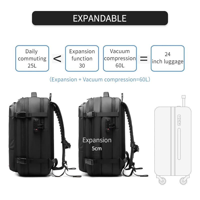 Denna ryggsäck expandera upp till 60 liter - samma som en 24-tums rullväska. När den inte är utbyggd är den smidig, kompakt och lätt att bära. Perfekt för trånga flygplatser, stadsgator och weekendutflykter. Säg adjö till skrymmande bagage och hej till enkel, effektiv packning.