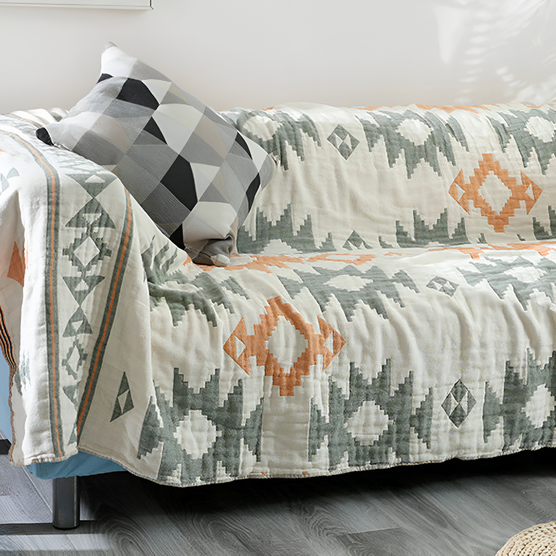 Upplev ultimat komfort med vårt Vändbara Geometriska Filtsofföverdrag. Tillverkat av 100% bomull, har det ett fantastiskt geometriskt mönster på ena sidan och en lugnande enfärgad nyans på den andra. Lättviktigt och andningsbart, kan det användas som en filt eller sofföverdrag, vilket gör det perfekt för alla årstider.